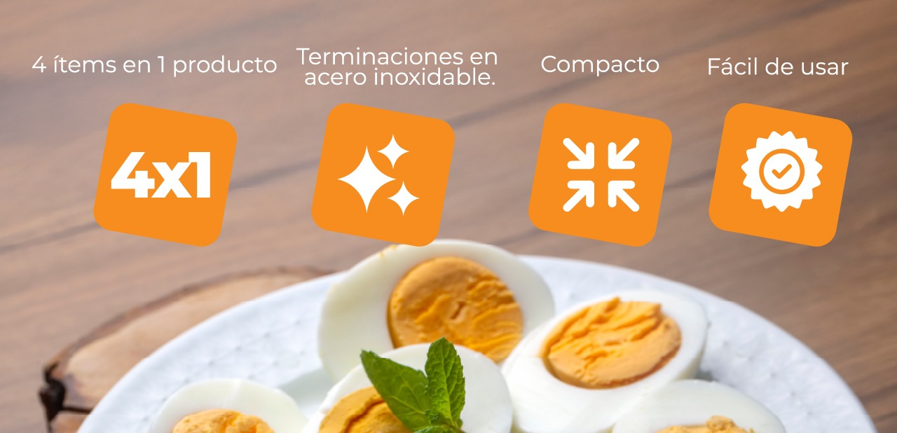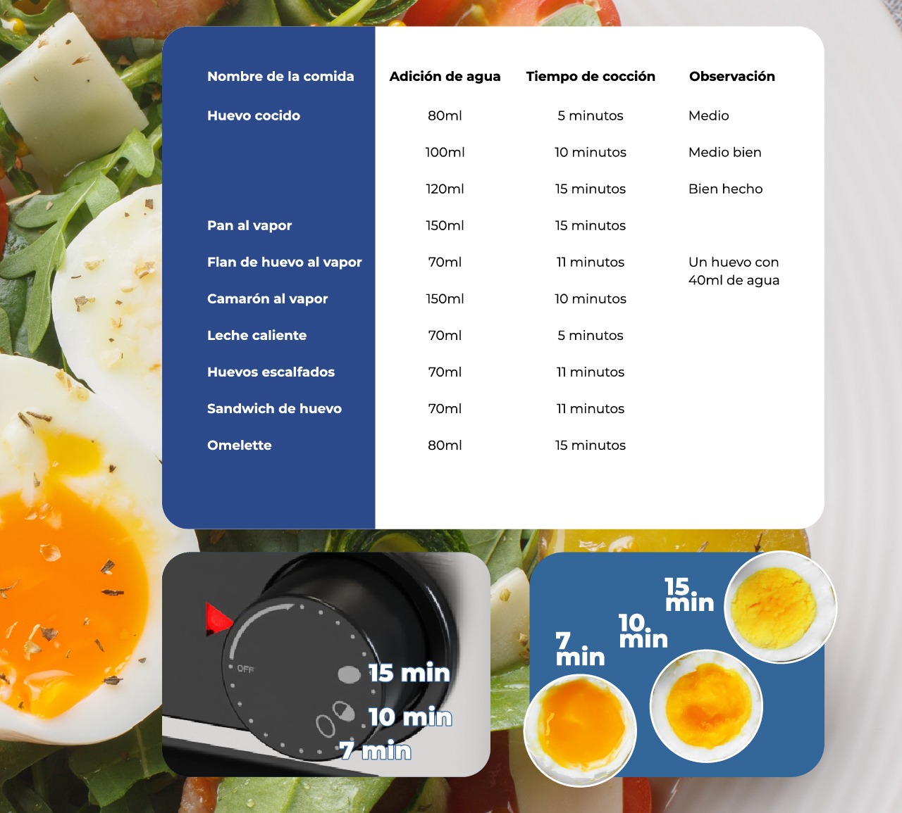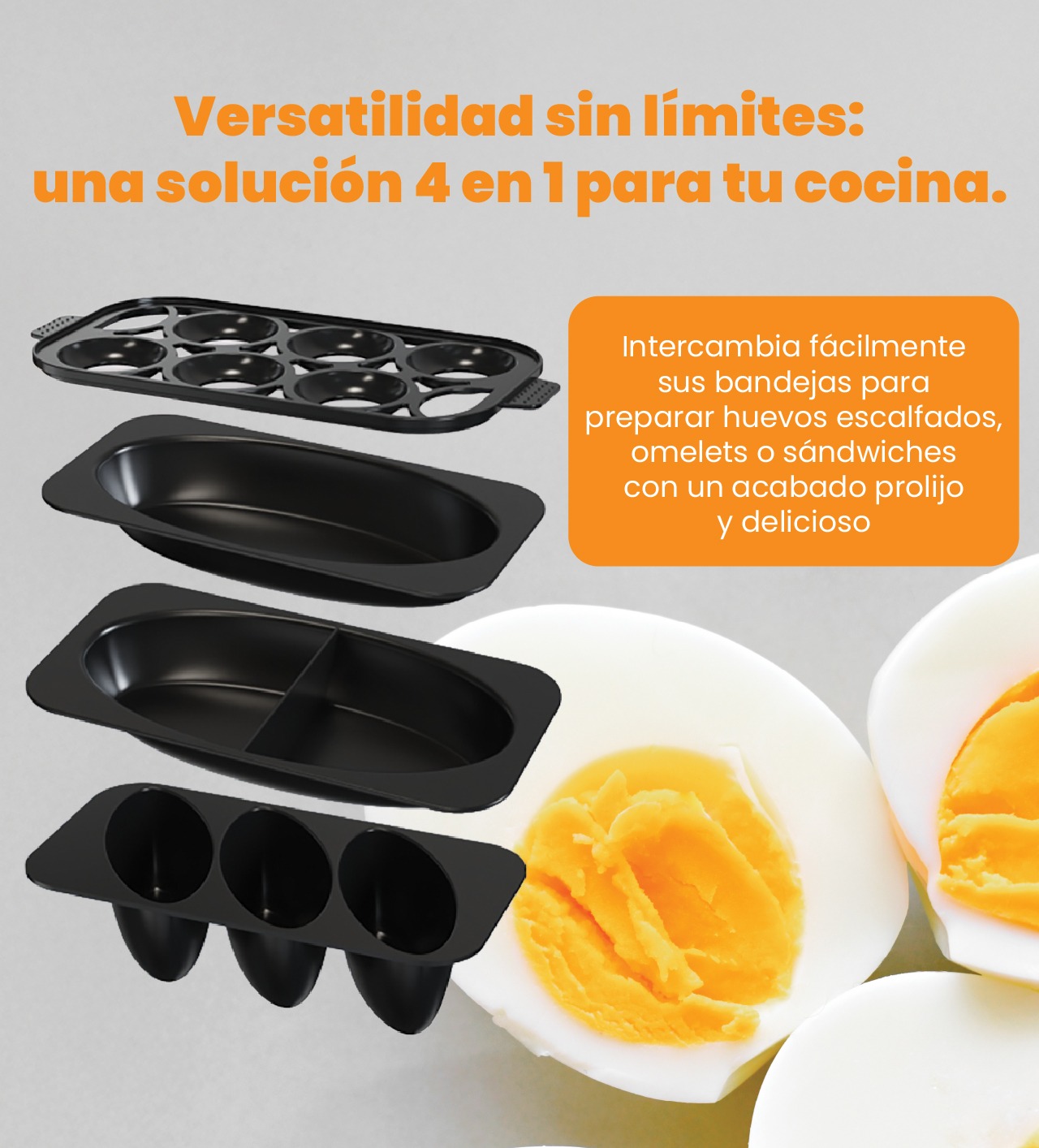 Incluye bandejas para preparar omelettes, huevos pochados y también permite cocinar al vapor, además de capacidad para hasta 6 huevos al mismo tiempo. Incorpora vaso medidor con perforador para huevos de hasta 80 ml y señal de aviso al finalizar la cocción o cuando falta agua.