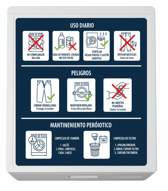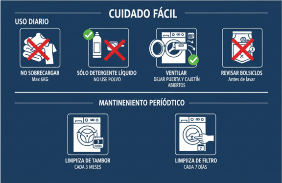 Incorpora sistema inteligente de lavado, Auto Balance para mayor estabilidad, eliminación de espuma y memoria ante cortes de energía. Su panel LED táctil permite un manejo sencillo y preciso, ajustando temperatura, velocidad y funciones adicionales.