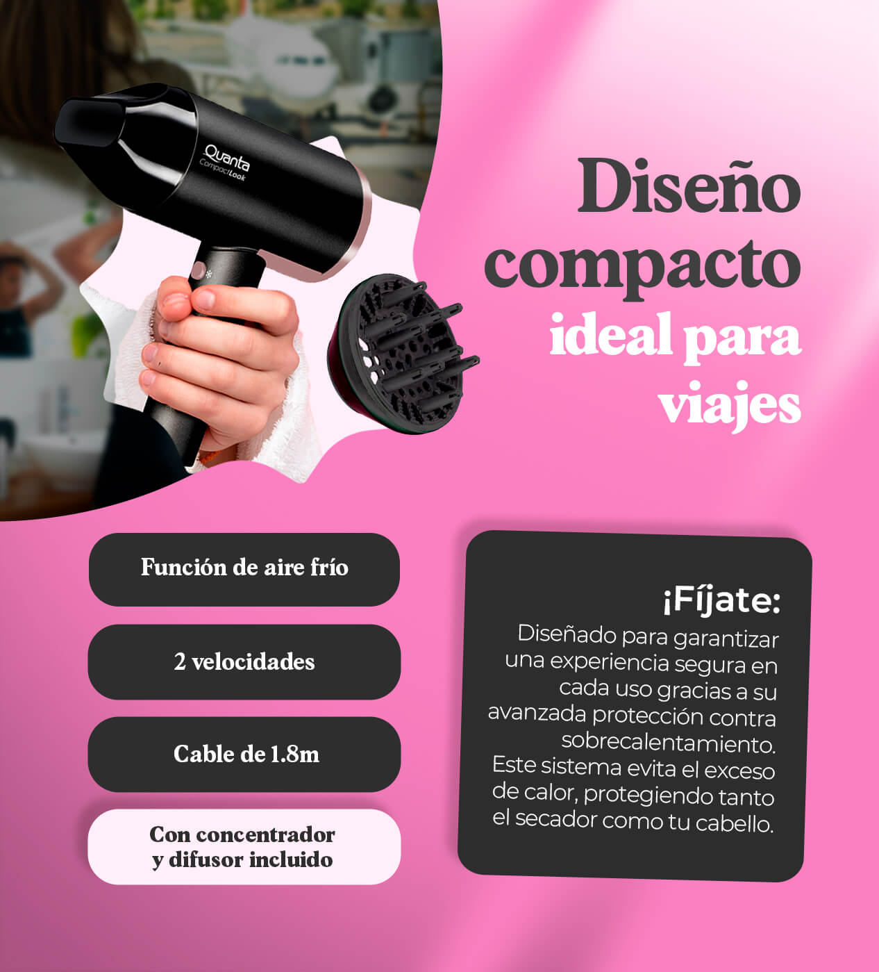 - Potencia: Rango de 1800 a 2000W, ofreciendo un secado eficiente y rápido.